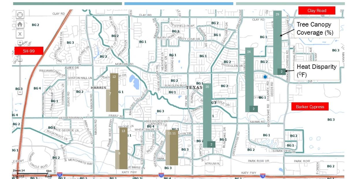 Katy North is made of 43 Census Block Groups. This chart shows two measures of urban heat - the "Tree Canopy Coverage" or the percentage of the block group's total area that is covered by tree shade. The "heat disparity" is the number of degrees Fahrenheit that the block group's ambient temperature exceeds comparable temperatures in urban areas. The area average for canopy coverage is 17%, and the average heat disparity is 7.8 degrees F. Note: only block groups with measures significantly greater than the area average are depicted. The green bars identify block groups that are disproportionately cooler than the average; the brown bars identify block groups that are disproportionately warmer than the aveage.